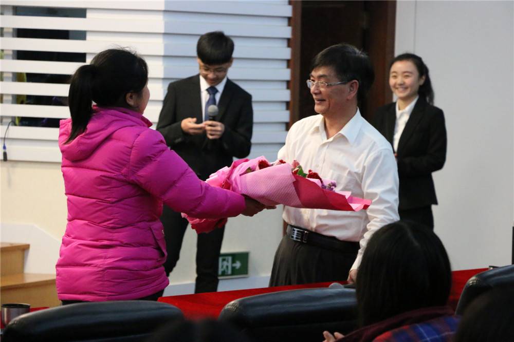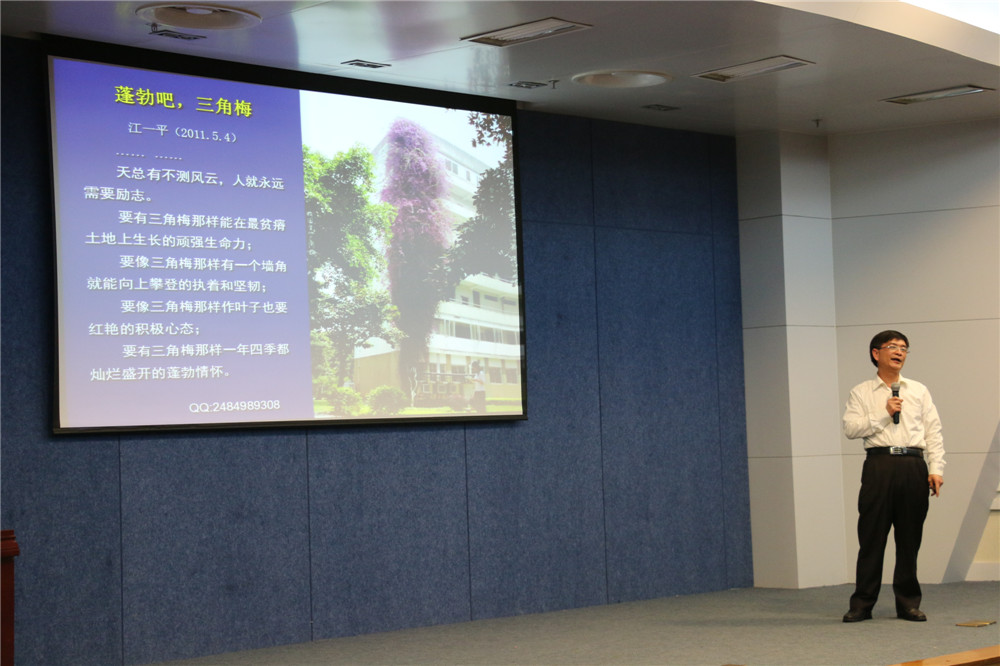 首先,江教授根据前期收集到的资料深入分析了同学们成长中遇到的问题,解决了路在何方的困扰,解答了大学该如何度过的疑问,并强调了榜样对当代老员工的作用。进而以自身青春故事的实例告诫同学要做一株山野里的三角梅,即使是一片叶子也要如同花朵般绽放风华,不惧骄阳骤雨,要有敢于在风雨途中言雪的大度与魄力,以苦为乐。要如王安忆笔下写的那样在任何地方都要把快乐挖掘出来,又如舒婷所描述的越是生冷的地方,越显得放浪、美丽,不拘墙头、路旁,无论草坡、石隙,只要阳光长年有,春夏秋冬,都是你的花期。他指出于我们当代老员工而言,最重要的是要有对人生的价值和对目标的思考。江教授提出人生不仅是谋生,更要有独立的人格与思想;重要的不是做什么工作而是要成为一个怎样的人;要对自己的一生做出长远而系统的规划。江教授同时强调这世界不止眼前的苟且,还有诗和远方。当下的苟且并不会埋没你的理想与绚丽,矢志不渝,拥有着独立的思想,如同三叶角梅,即使是叶子,却也有花朵般的绚丽。