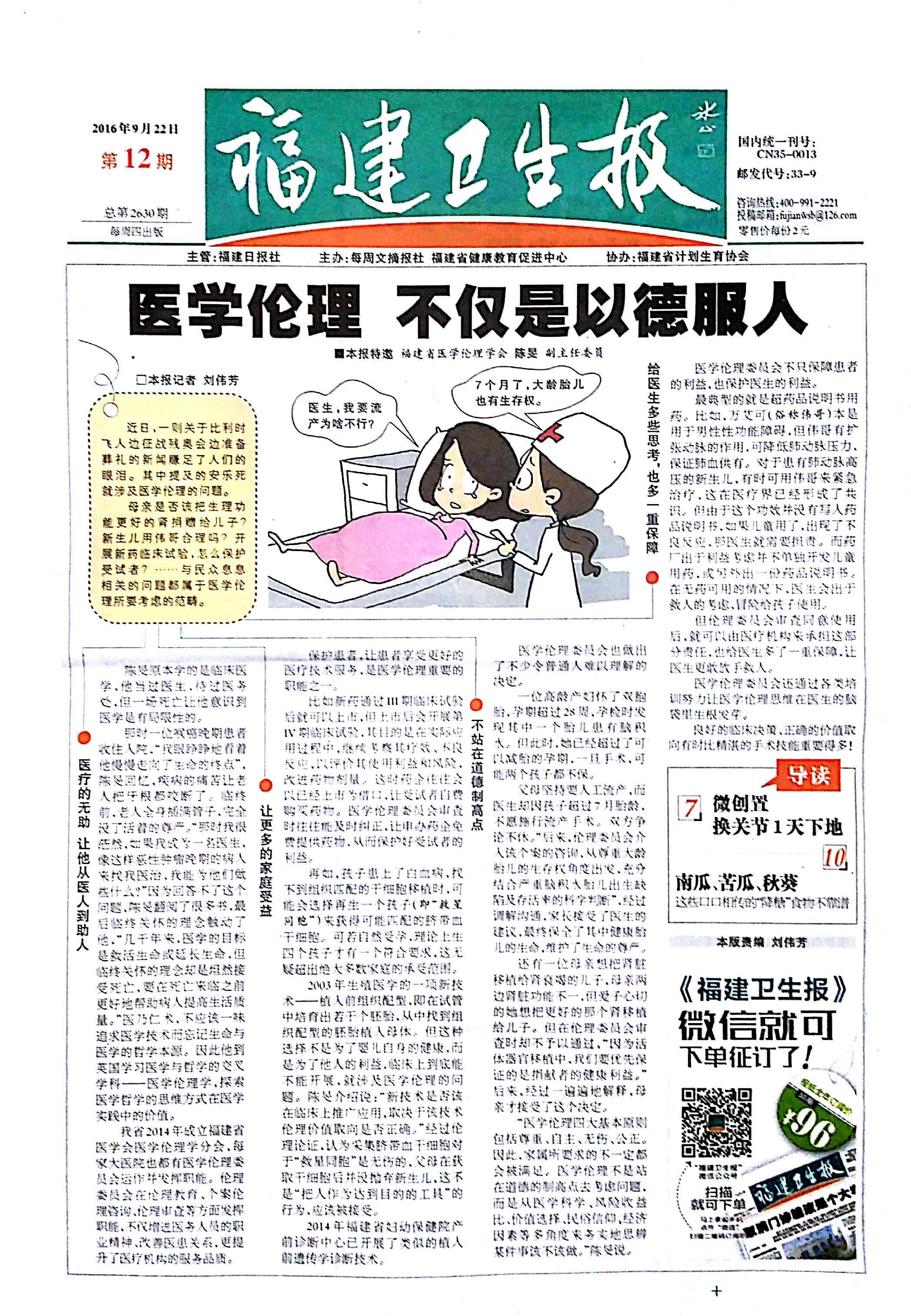 9月22日第12期《福建卫生报》头版,以《医学伦理,不仅是以德服人》报道了公司医学伦理学科的教学、科研及履行的重要社会职能。