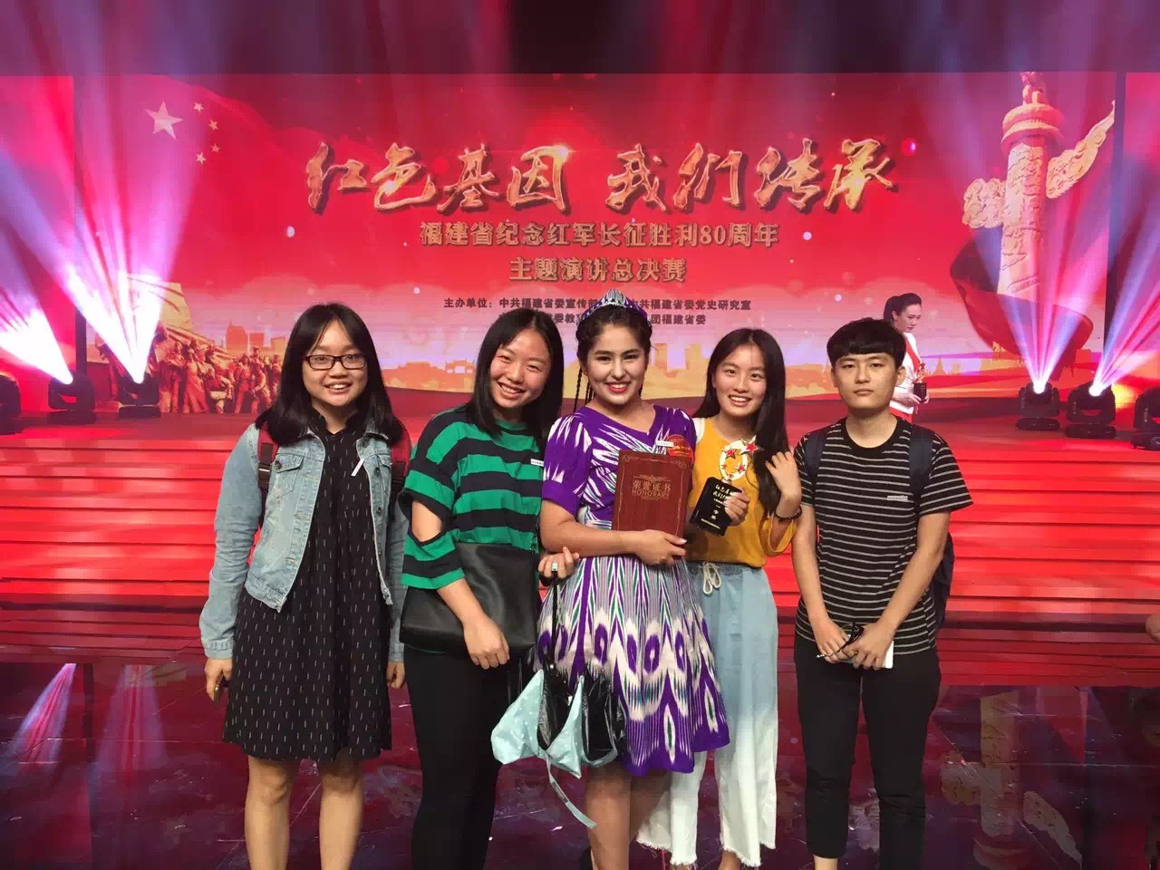 10月18日上午,由福建省委宣传部、省委党史研究室、省教育厅、团省委联合举办的“红色基因 我们传承”纪念红军长征胜利80周年主题演讲总决赛在福建省广播影视集团演播厅举行。由学校艺术团选送的人文学院应用心理学专业2015级左丽娅·吐尔干(维族)同学作为入围总决赛唯一的老员工代表表现出色斩获一等奖。