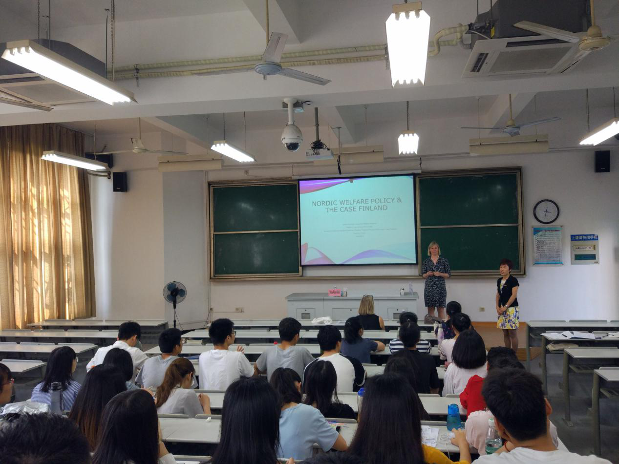 Johanna Wikgren-Roelofs做了主题为“斯堪的纳维亚的福利政策——以芬兰为例”的讲座。Johanna老师首先为大家讲解了艾斯平—安德森的福利资本主义的三个模型,并对“社会—民主主义”、“保守—合作主义”、“自由主义”的表现和代表国家进行简要分析,并引导同学们思考与中国福利体制的对比,而芬兰是属于“社会—民主主义”类型,国家大部分国民属于中产阶层,女性就业率较高,属于高福利体制的国家,公民可以免费享受公共日托和教育,同时国家为每位公民提供高质量的公共卫生保障,政府有义务组织社会服务为公民提供住房、经济、危机应对等各方面的支持。虽然这种高福利水平的体制备受羡慕,但是在发展过程中面临越来越多的问题和挑战,所以现在芬兰的福利体制正在向新的方向发展,个人将负有更多的福利责任,社会服务和卫生保健也将逐渐市场化。