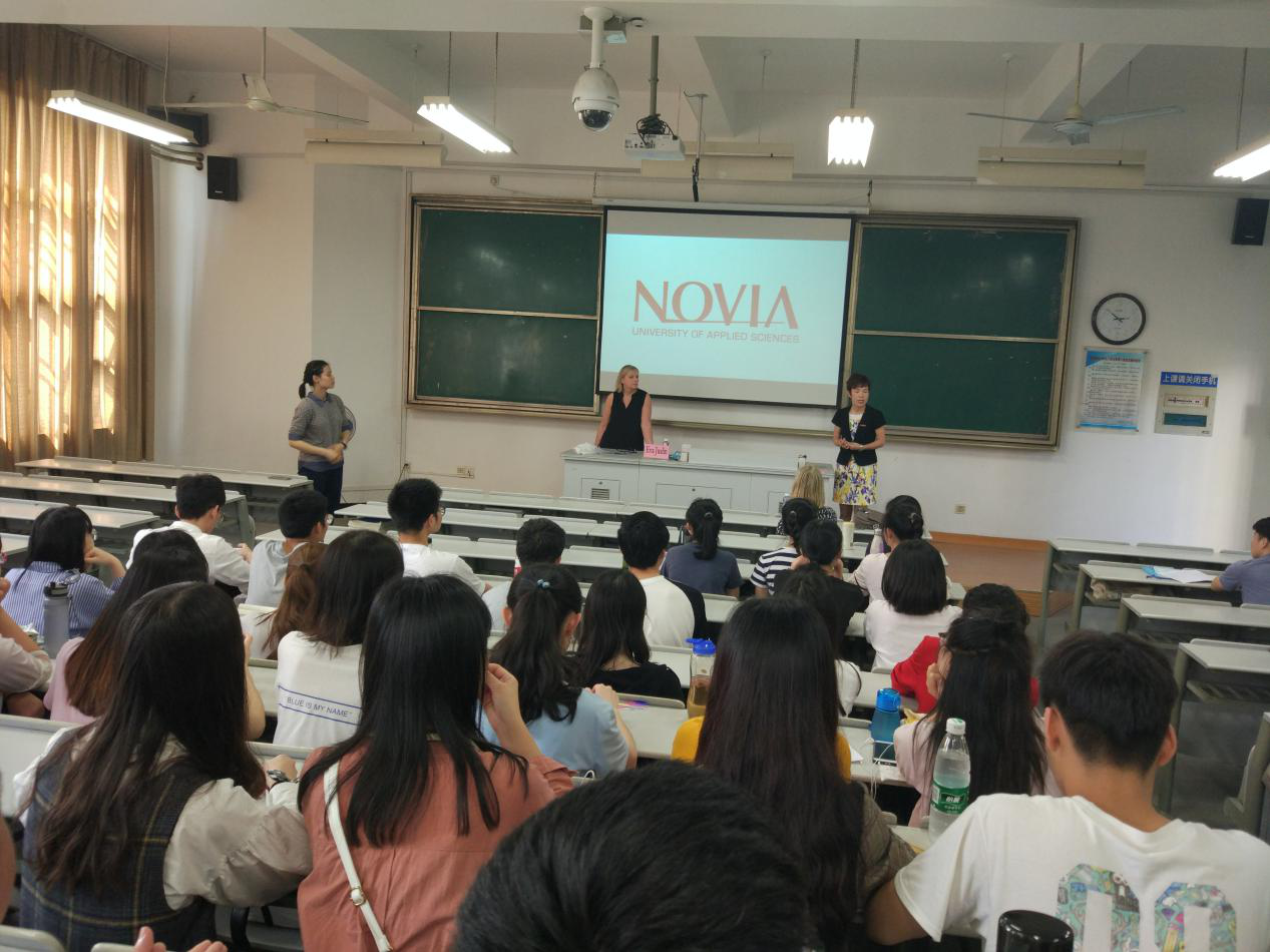 4月26日,芬兰诺维亚应用科技大学的两位嘉宾在第4教室与各位老师和同学们进行了深入而友好的交流。Eva Juslin主任做了主题为“诺维亚应用科技大学社会工作项目简介”的讲座。首先,Eva主任风趣的介绍了芬兰的基本国情和诺维亚大学的概况,作为芬兰最大的瑞典语大学,诺维亚应用科技大学共有四个校区,目前有4000余名员工,可以提供瑞典语和英语的学士与硕士学位,而且诺维亚应用科技大学是芬兰一所高质量的高等教育机构,通过了芬兰教育评估中心和国际标准ISO 9001认证。接下来Eva主任详细介绍了社会服务与健康照顾的学位项目,其培养计划是以工作为导向的,学士学位要修满210-270个学时,一般为3.5-4.5年的学习计划,硕士学位要修满60-90个学时,一般为1.5-2.5年的学习计划,员工在校的研究内容包括核心课程和专业课程、选修课程、实践培训和论文四类。最后Eva主任简单介绍了社会服务与健康照顾学系的研究项目、对外交流情况和2018年的招生和学习概况。