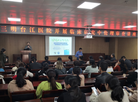 交流调研结束后,陈旻副经理为台江医院的医护员工、科研人员和基地带教老师做了《临床研究中的伦理审查——精神障碍患者人群的受试者保护》为主题的讲座,帮助医院医务工作者提高受试者保护意识,维护弱势群体权益,保障临床科研开展时的伦理审查有序开展。这也是人文公司医伦与管理教工党支部伦理知识普及培训的系列活动之一。
