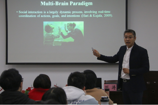 27日下午刘涛教授开展了一场题为《fNIRS在群体行为研究中的应用》的讲座。首先为大家生动地介绍了fNIRS,接着从多人神经科学开始讲述,通过两个群体脑网络实例让大家对fNIRS在群体行为研究中的应用有了更深入的认识。最后在讨论交流环节,师生们抓住难得的机会,积极向刘涛教授提问咨询。