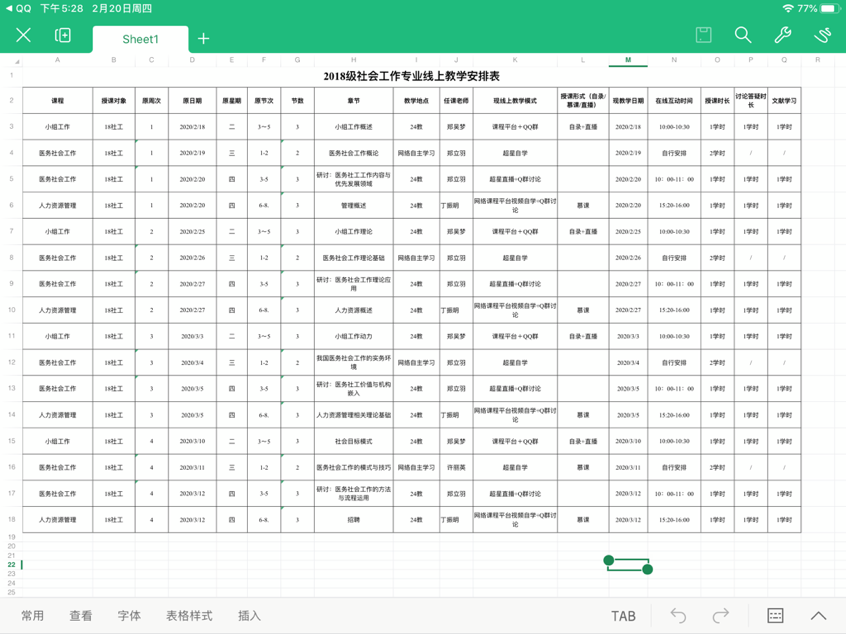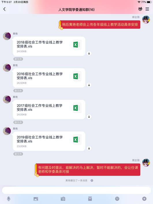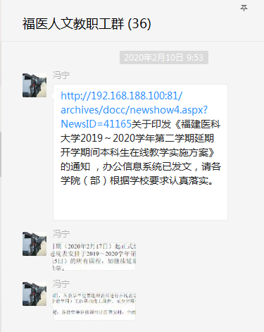 人文学院领导高度重视疫情防控期间的在线教学工作,学院各部门上下统筹,师生主动配合。学院教学科研办公室及时转发教务处和研究生院关于疫情防控期间教学工作要求的文件,学系、教研室负责人提早两周在教学工作群发布协作表单,确定教师线上课程进度安排的和平台准备情况。