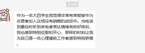 ●最感动、印象最深刻的是帮助危机咨询者度过危机的时刻。过程中得到了同行之间、前辈后辈之间的互相支持和协作,也从不同的伙伴、同行身上学到非常多宝贵的经验和智慧。另外通过这次志愿服务,感觉这些年的学习和实践很有价值,可以去整合地思考、灵活地引导不同来访者,帮助来访者发现本来有的资源并为当下所用,这一点非常令自己欣慰。