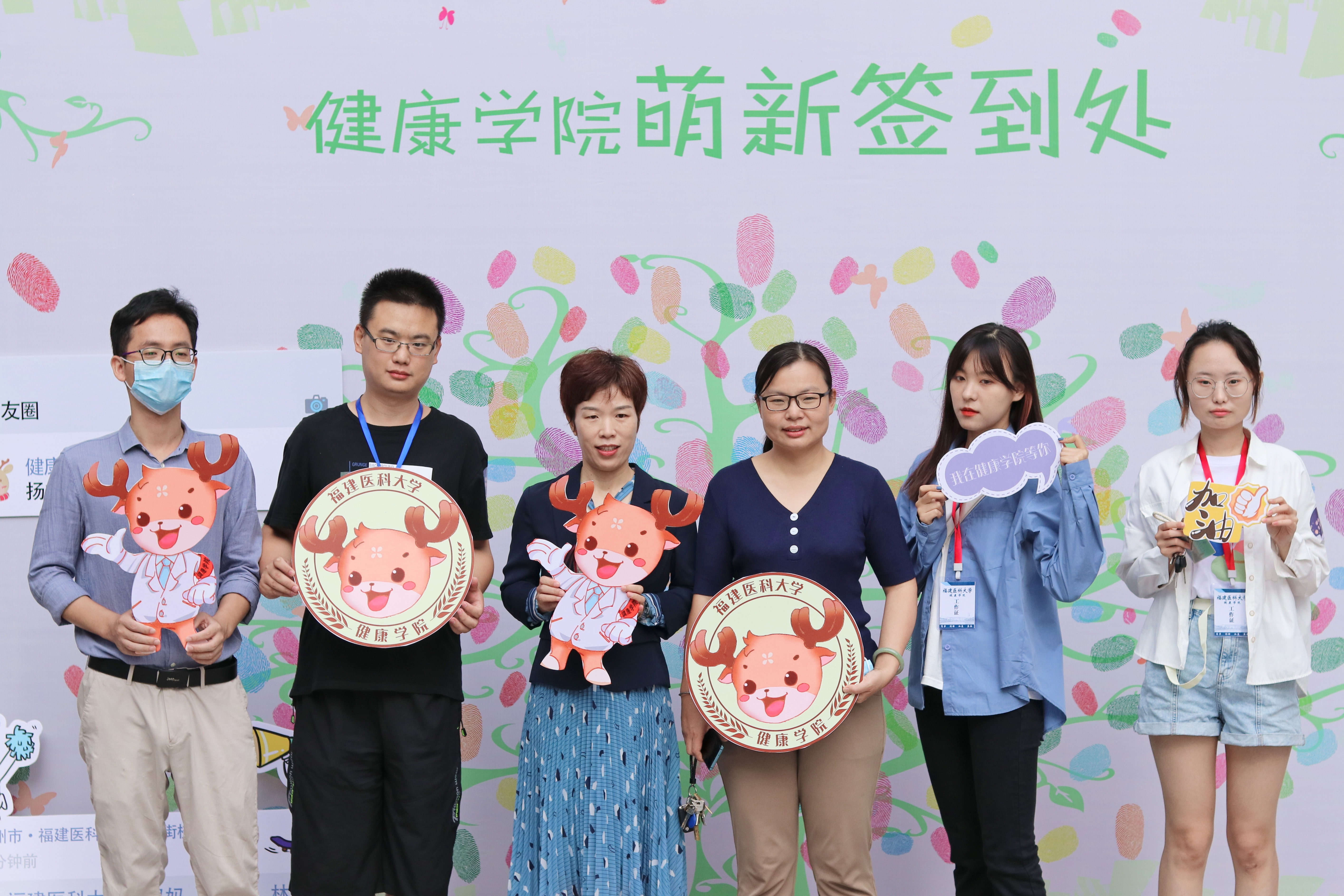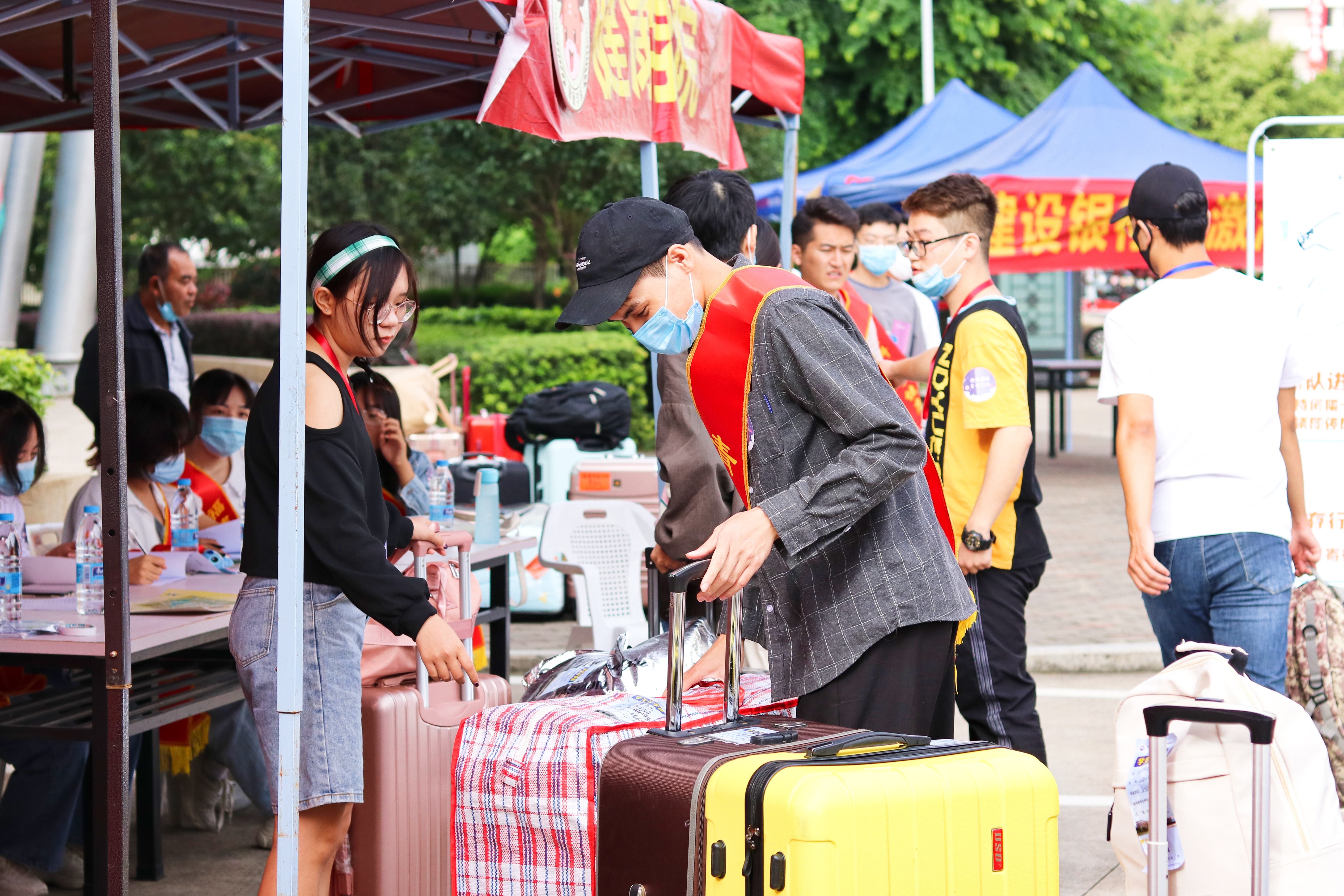 2020级辅导员曹杰和负责搬运行李的志愿者合影 老师和班导助导在签到墙前合影