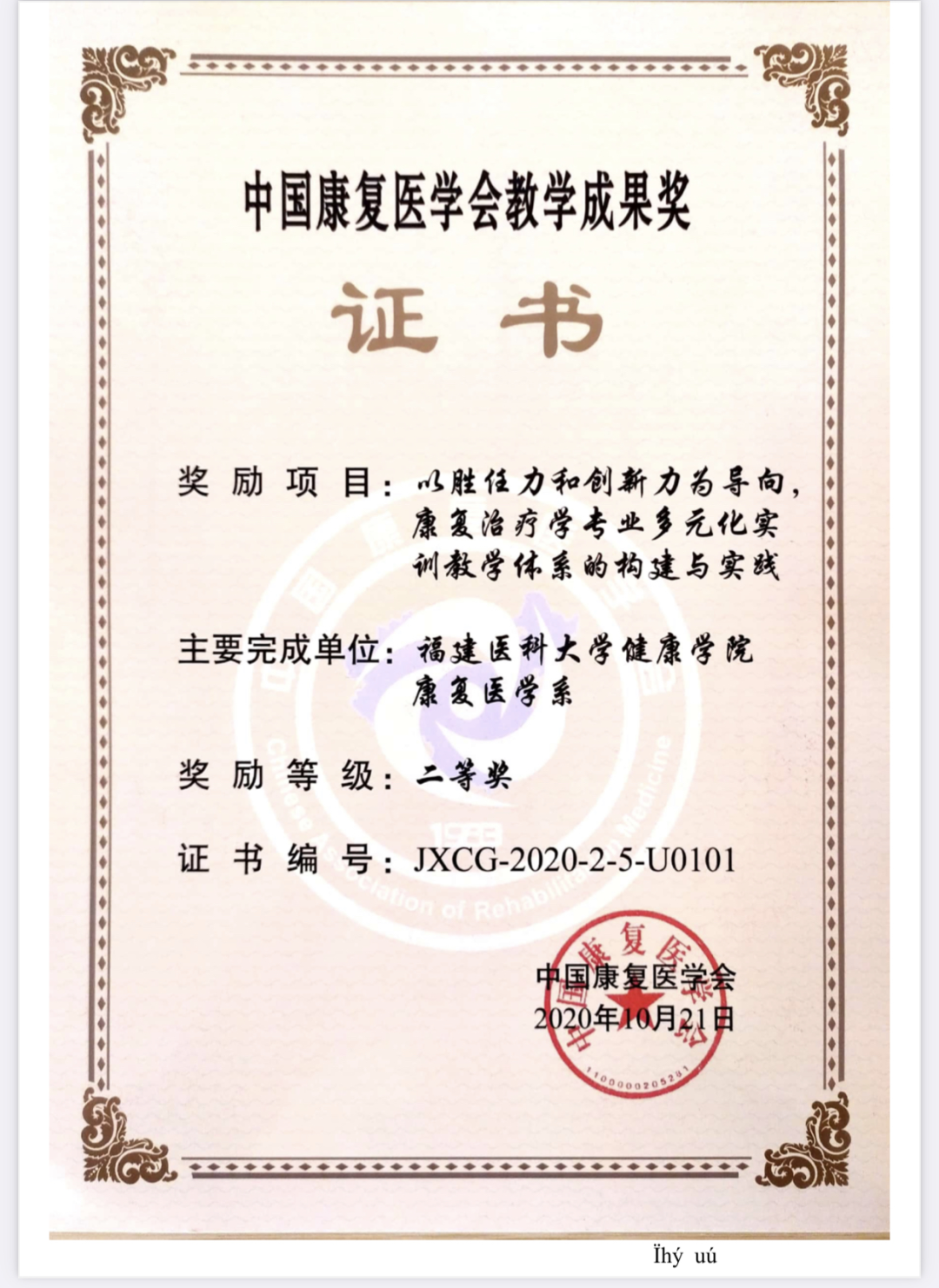 近年来,公司康复医学系在教学科研方面上逐步上升,获得国自然面上基金2项,国自然青年基金1项,福建省自然科学基金4项,以及8项国家专利、17项校级、5项省级与7项国家级竞赛等荣誉。我们将珍惜荣誉,戒骄戒躁,再接再厉,再创佳绩。坚决深入贯彻国家康复医学教学方针政策,发扬刻苦钻研、团结协作、勇攀高峰的精神,加强实践教学和理论创新,不断提高教学能力和研究水平,为推进康复医学教育事业发展、助力健康中国建设做出新的更大贡献。