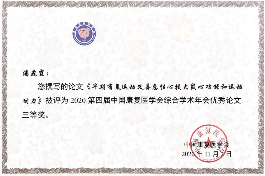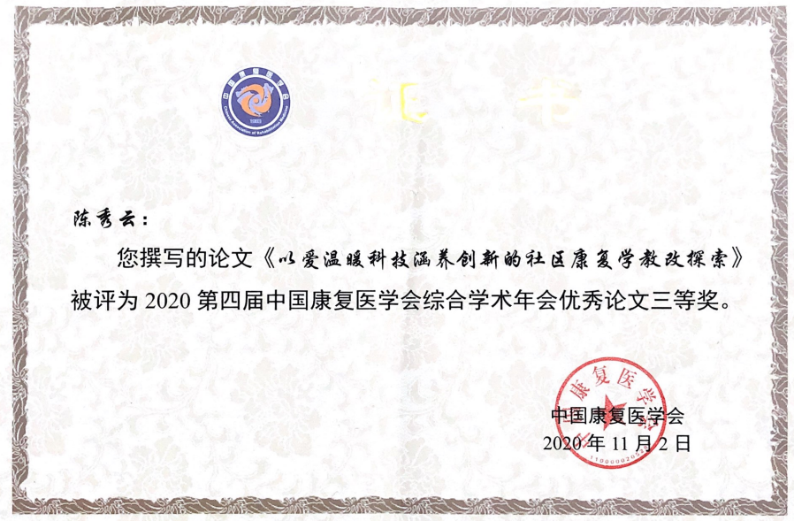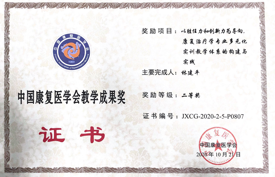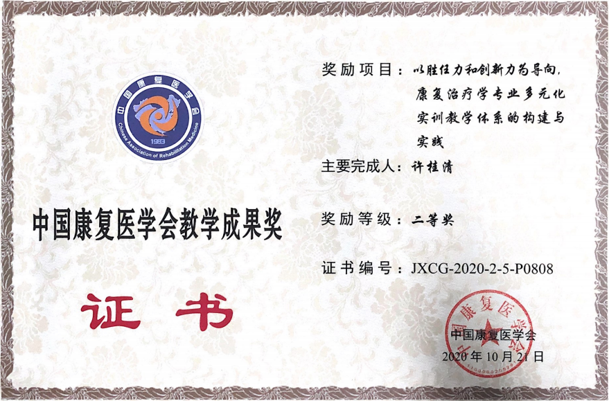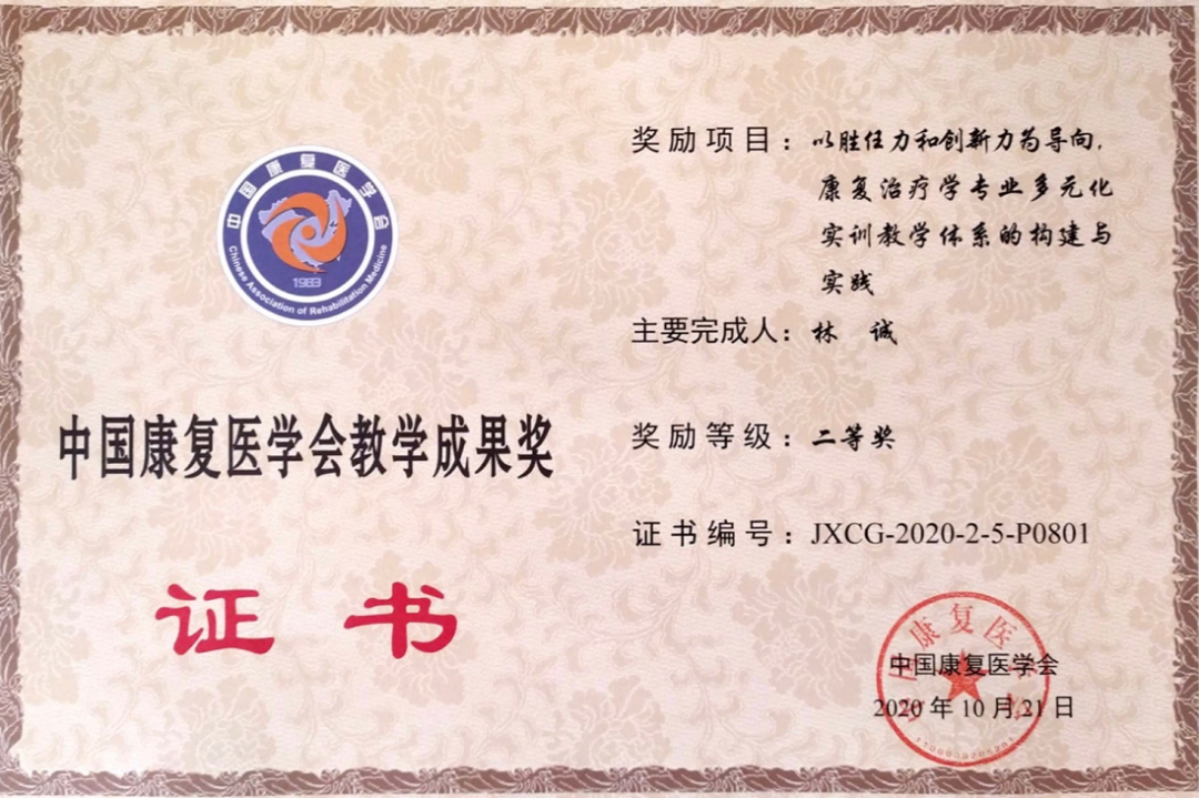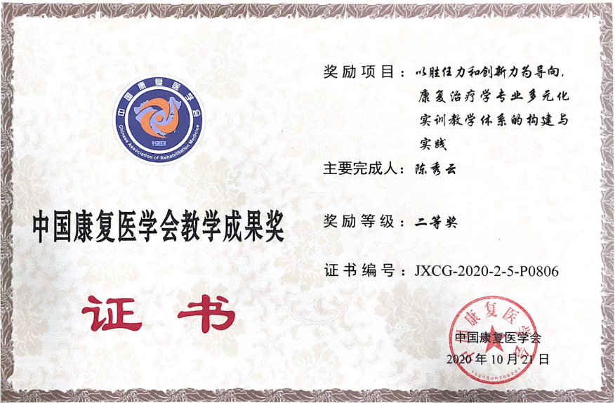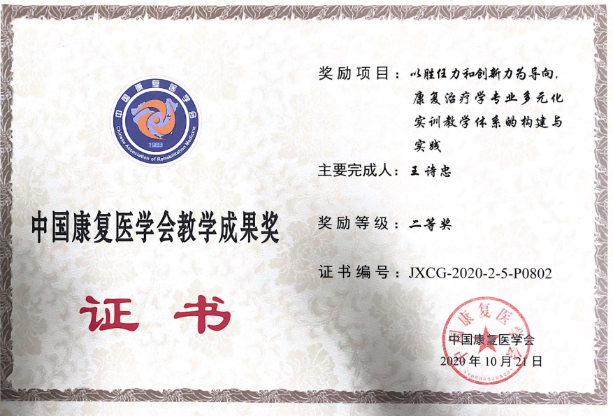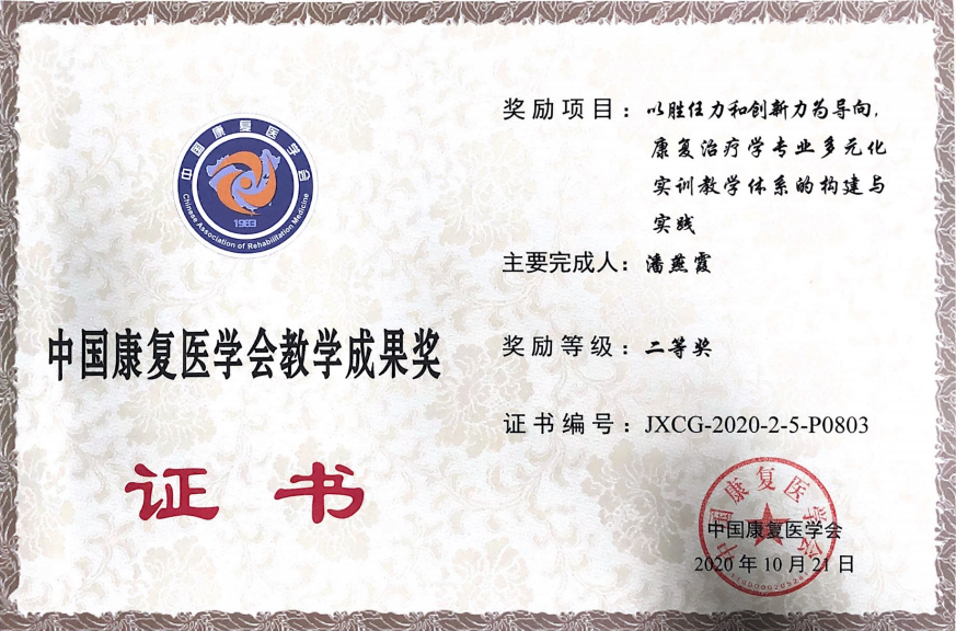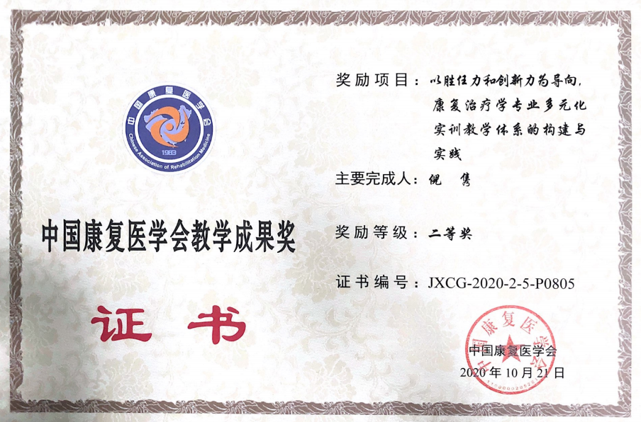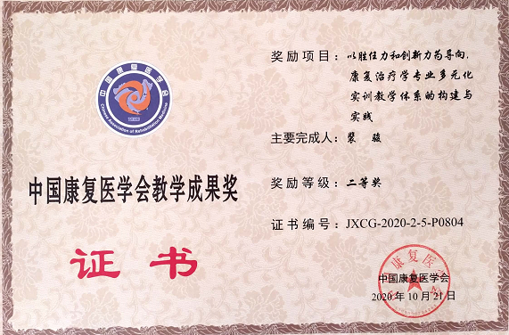 2020年11月26-29日中国康复医学会综合年会于北京国家会议中心召开,公司康复医学系以“胜任力和创新力为导向,康复治疗学专业多元化实训教学体系的构建与实践”项目,荣获2020年度中国康复医学会教学成果奖二等奖。