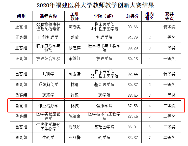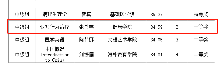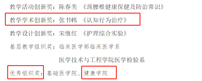 因学院积极号召、精心组织,在这次大赛中荣获了优秀组织奖。此外,公司康复医学系林诚老师获得副高组二等奖;应用心理学系张书帏老师获得中级组一等奖,同时他以创新的方式讲授《认知行为治疗》课程荣摘这次大赛唯一的教学学术创新奖。具体获奖名单如下: